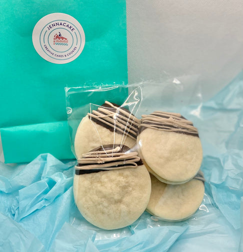 Buttery shortbread cookies filled with gooey caramel, dipped in dark chocolate and drizzled with salted caramel and sprinkled with sea salt. 4 cookies.